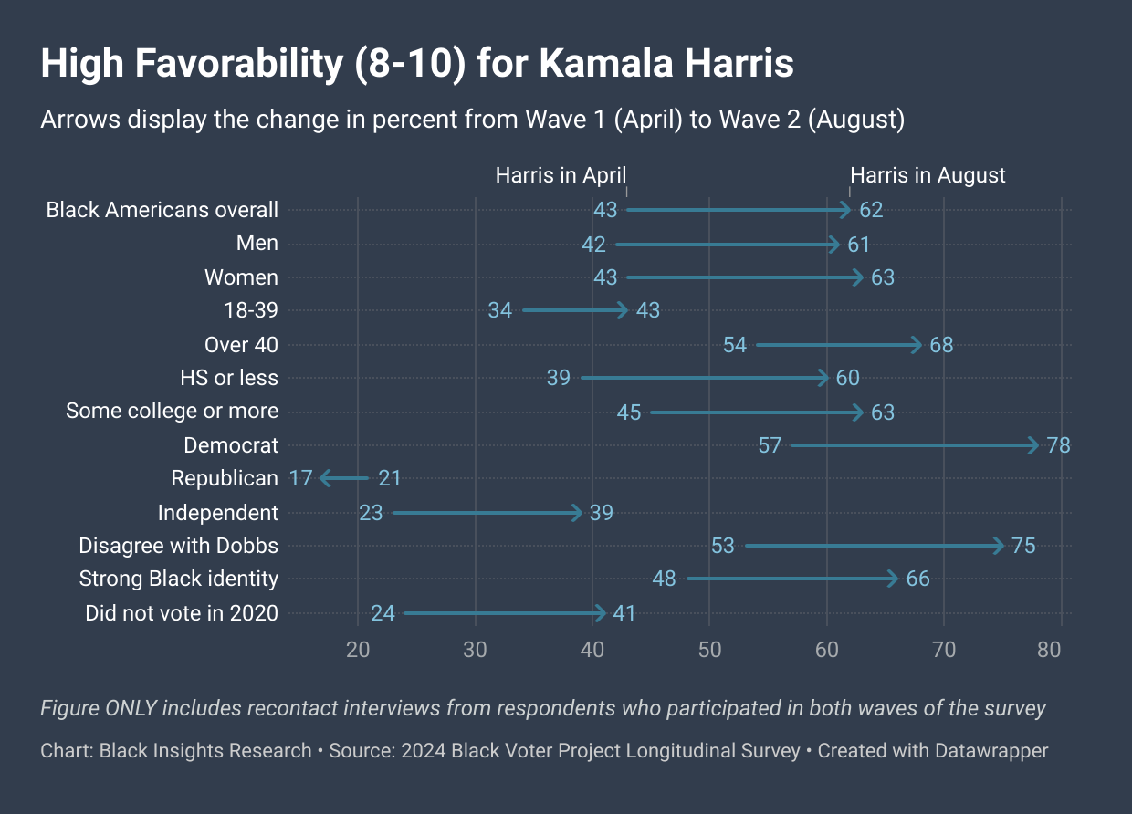 Overall, the percentage of Black Americans who rated Harris as very favorable (8-10. on a 10 pt. scale) jumped +19%, from 43% in Wave 1 to 62% in Wave 2.