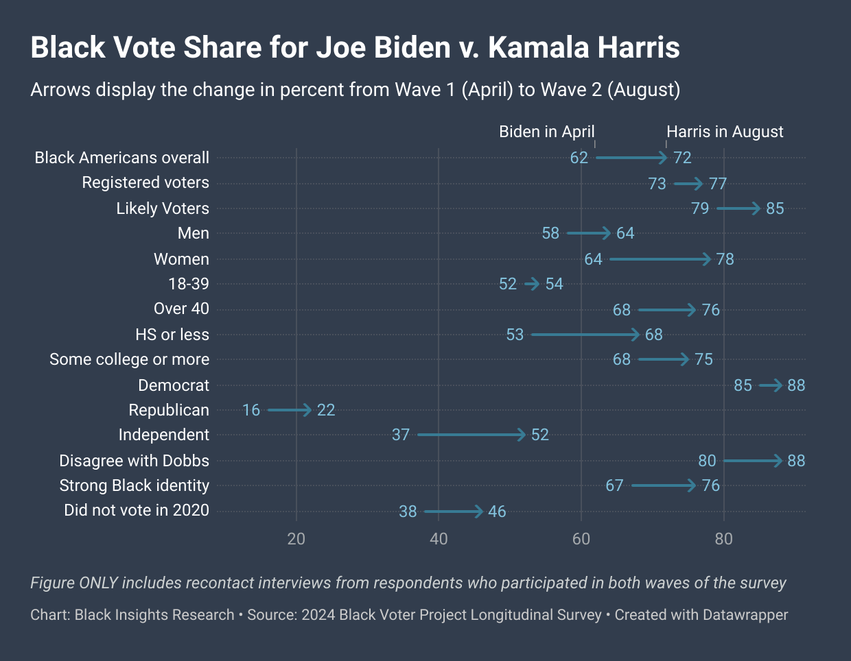 In addition to attitudes toward Harris (favorability), the switch from Biden to Harris also significantly increased the percentage of Black respondents intending to vote for the Democratic candidate. Here the data suggests positive changes in vote share for Harris across all demographic groups, this time even including Republicans: