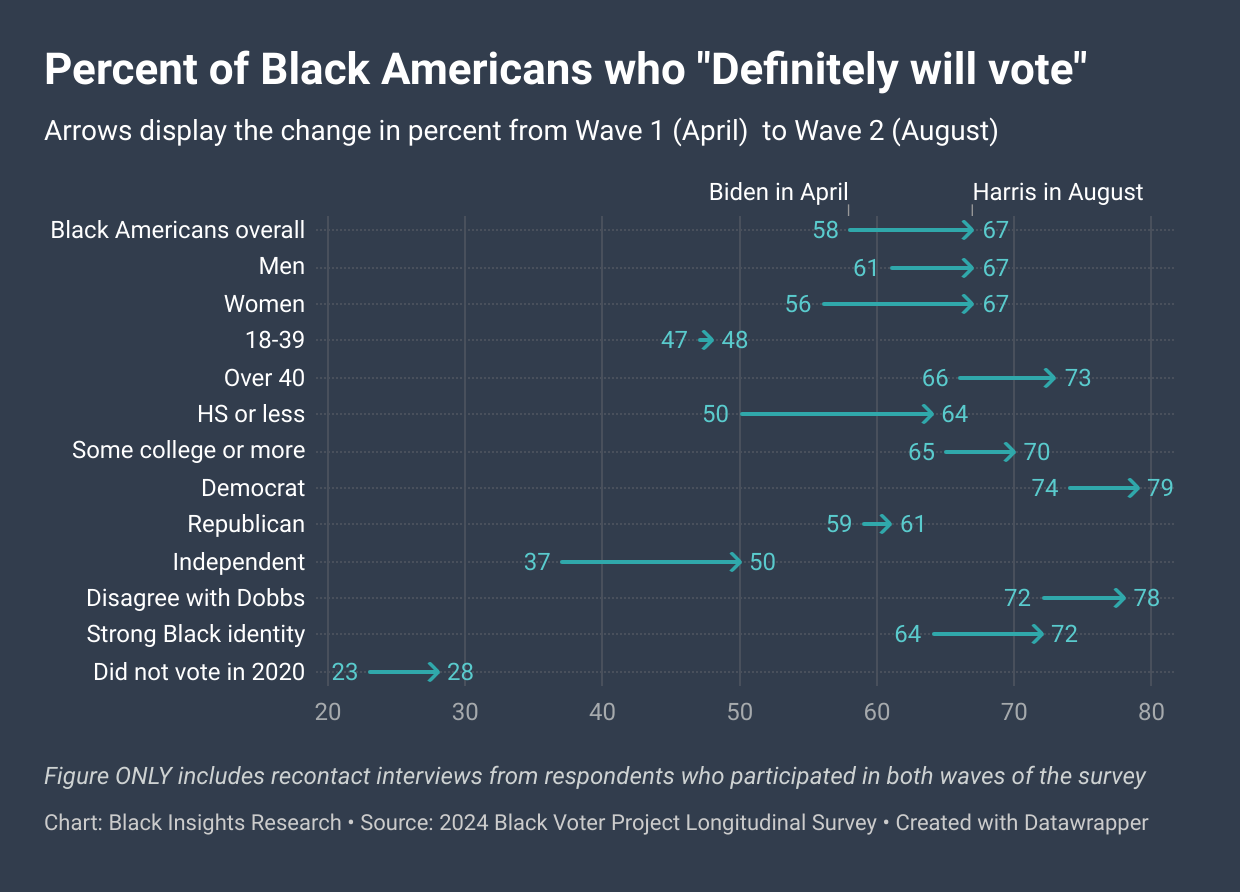 Lastly, moving Harris to the top of the Democratic Party ticket also increased the percentage of Black respondents who said they “Definitely will vote” for president in 2024: